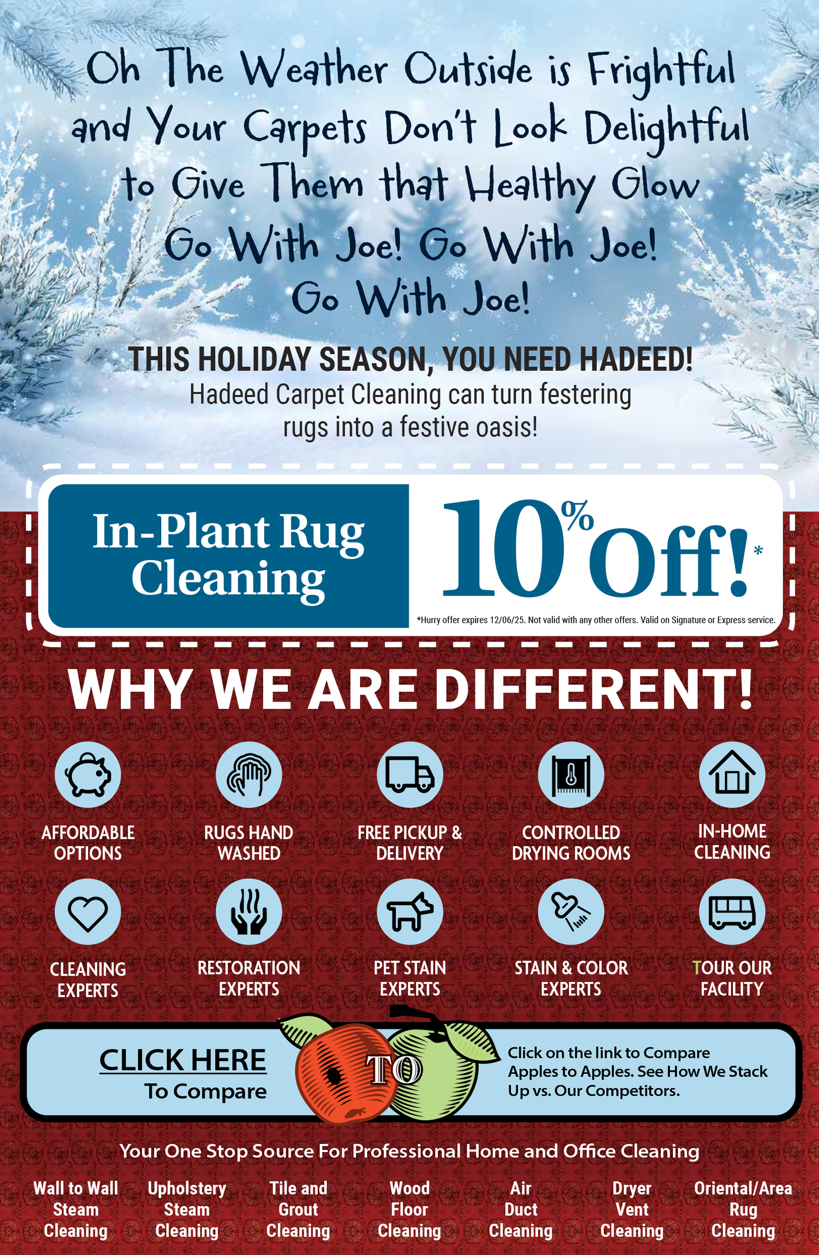 The holidays are approaching! Let Hadeed Carpet turn your festering rugs into a festive oasis. Enjoy 10% off in-plant rug cleaning and additional discounts on other services! Schedule your cleaning today and start the holiday season off right with Hadeed Carpet!