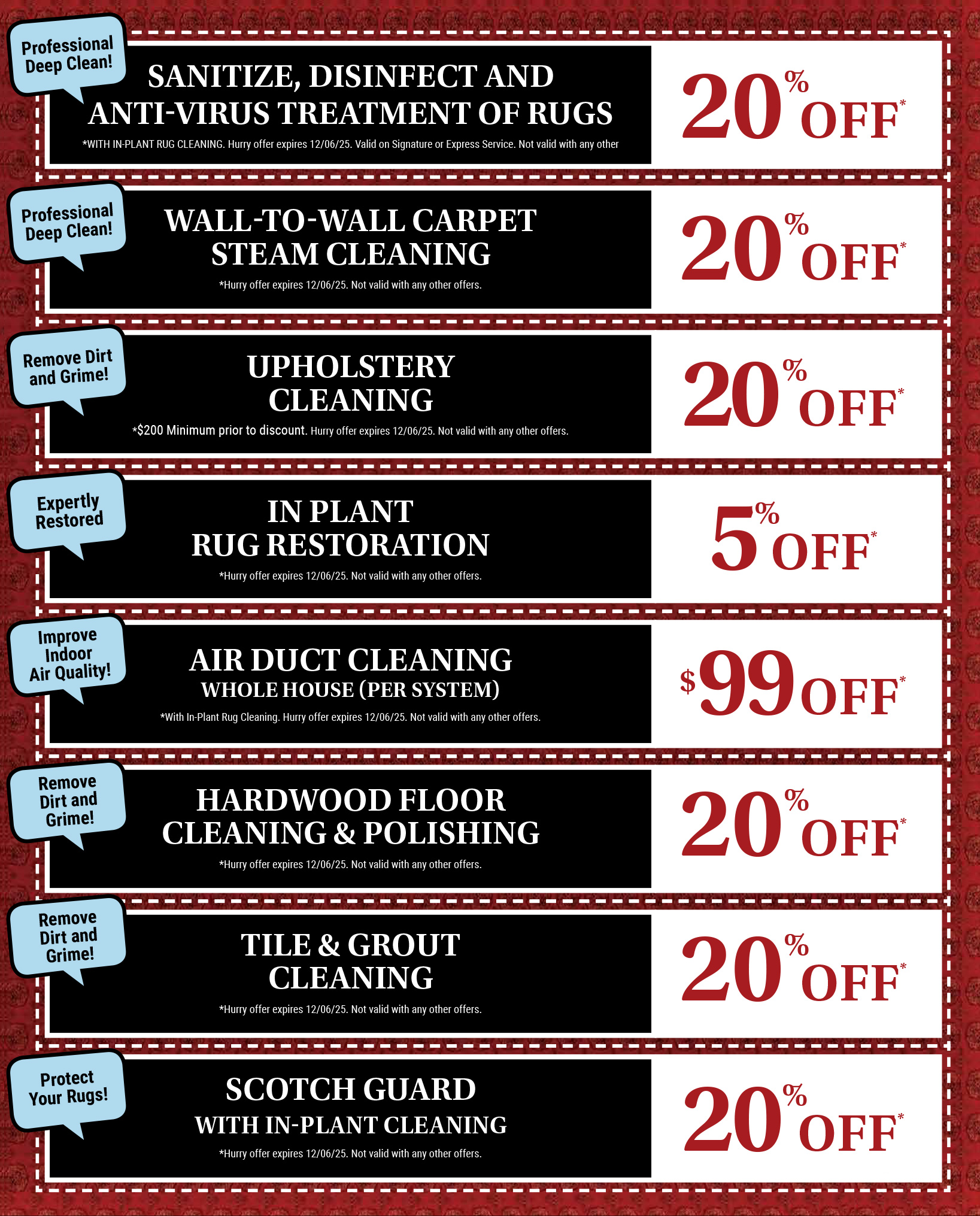 Prepare your home for the holidays with our rug cleaning services! Take 10% OFF your rug cleaning and make your home sparkle just in time for your guests. Our cleaning experts will remove all dirt, stains, and odors! Schedule with Hadeed Carpet today and save before the rush.