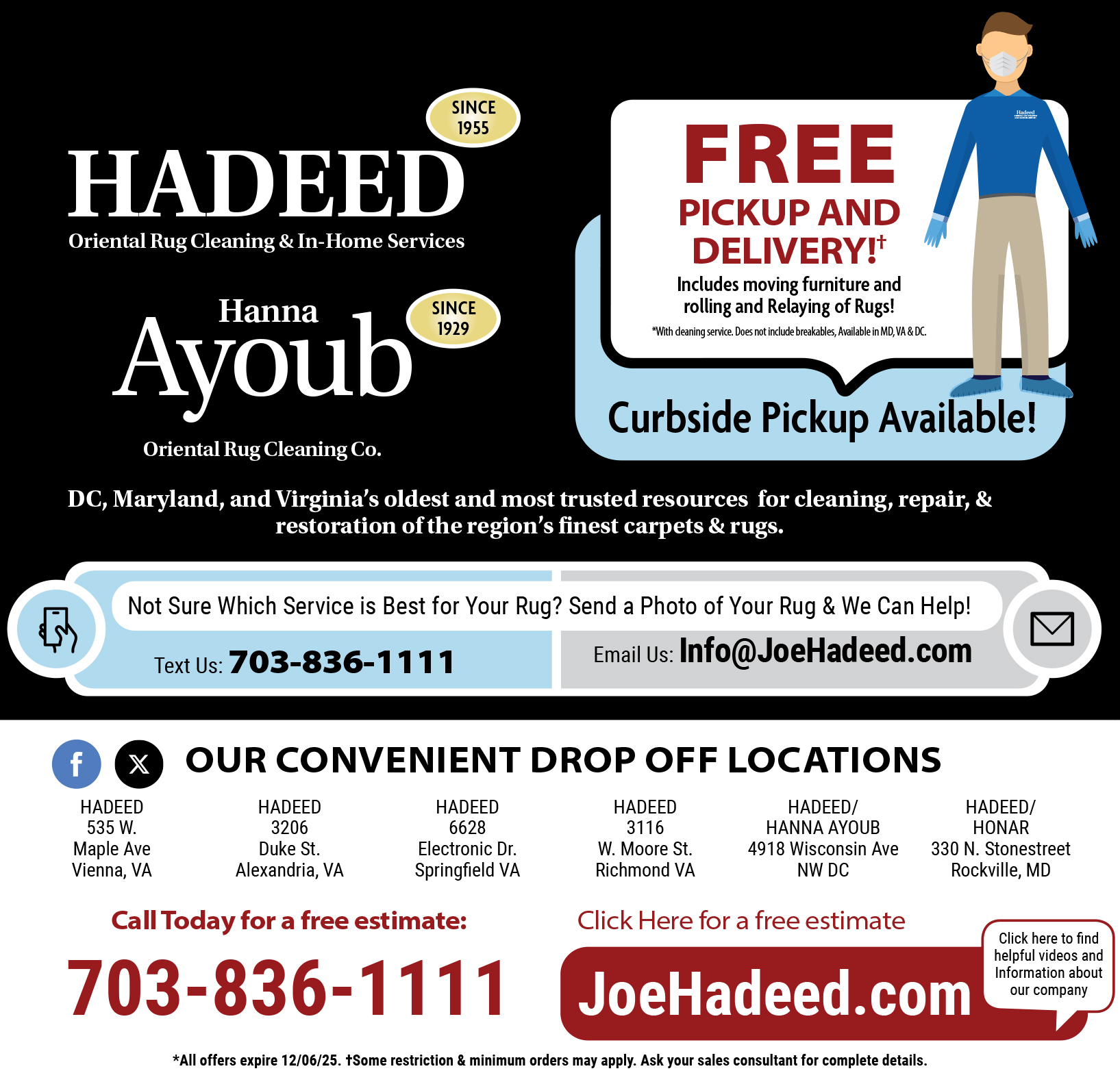Get 10% OFF rug cleaning this October. Bring your rugs back to life just in time for the holidays! Hurry before this offer ends. Call Hadeed Carpet to schedule your rug pickup and delivery!