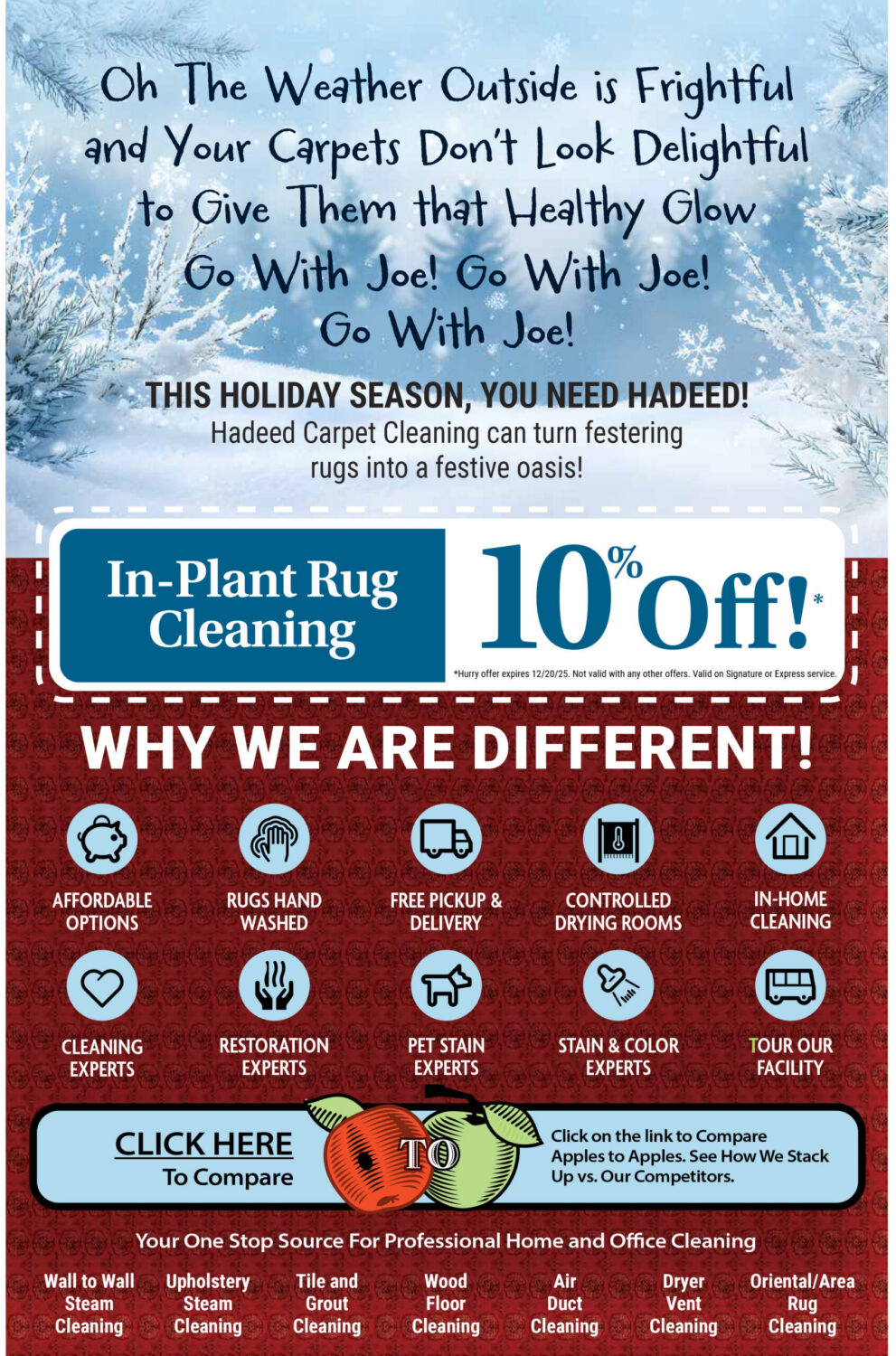 Prepare your home for the holidays with our rug cleaning services! Take 10% OFF your rug cleaning and make your home sparkle just in time for your guests. Our cleaning experts will remove all dirt, stains, and odors! Schedule with Hadeed Carpet today and save before the rush.
