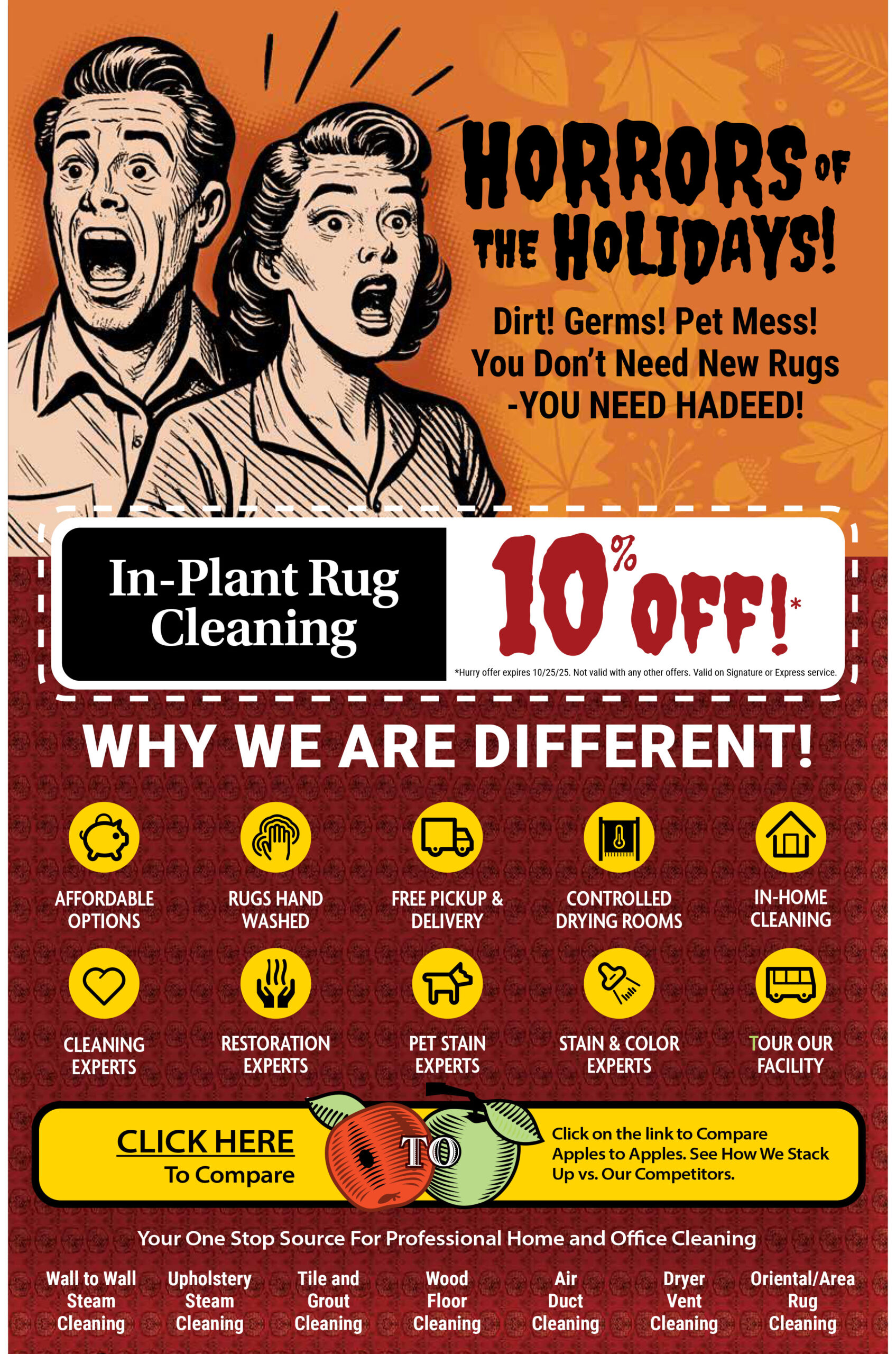 Only a few days left to take advantage of our October cleaning specials! Get your home holiday-ready with fresh, spotless rugs and carpets. Let the Hadeed Carpet cleaning experts bring your rugs back to life—schedule your service today!